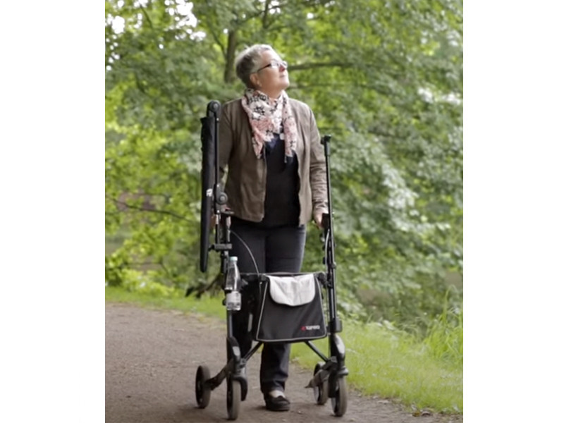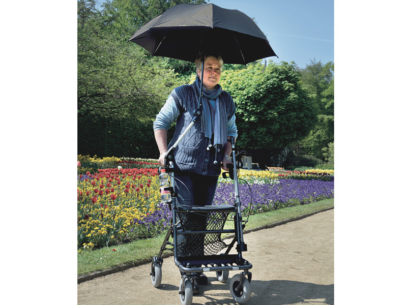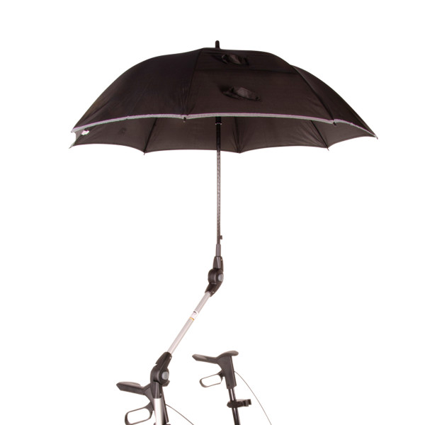 Protección contra el sol y la lluvia, que permite mantener ambas manos en el rolator. Resistente al viento. Paraguas de apertura automática y de dimensiones generosas, 100 cm de diámetro.