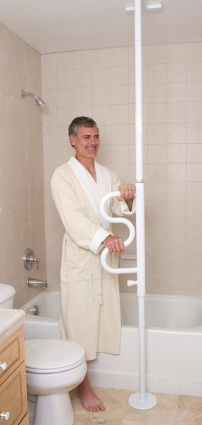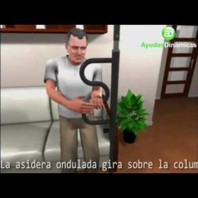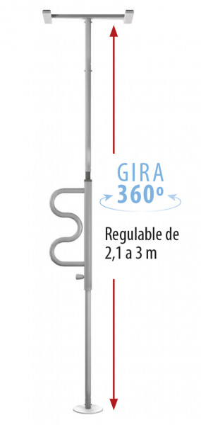 Esta columna se fija al suelo y al techo, sin necesidad de tornillos, simplemente por presión. La asidera ondulada gira sobre la columna pudiéndose bloquear cada 45º. Es muy práctica como ayuda para incorporarse de un asiento, junto a la cama o en el baño donde es especialmente importante la prevención de caídas.