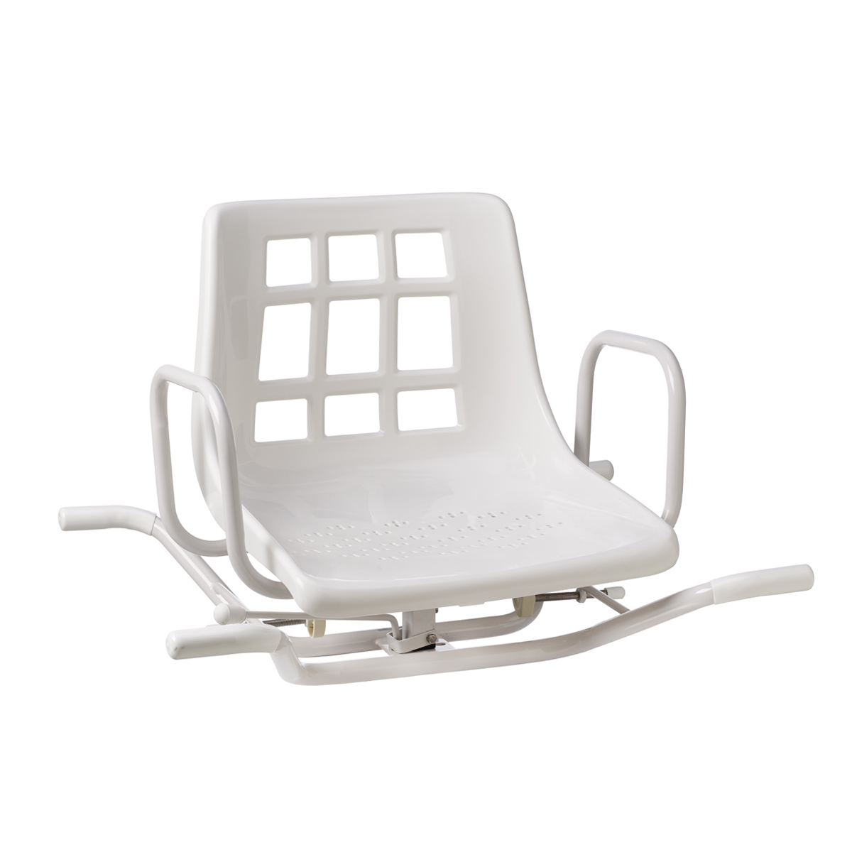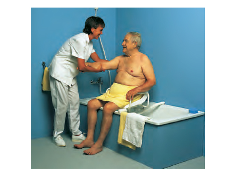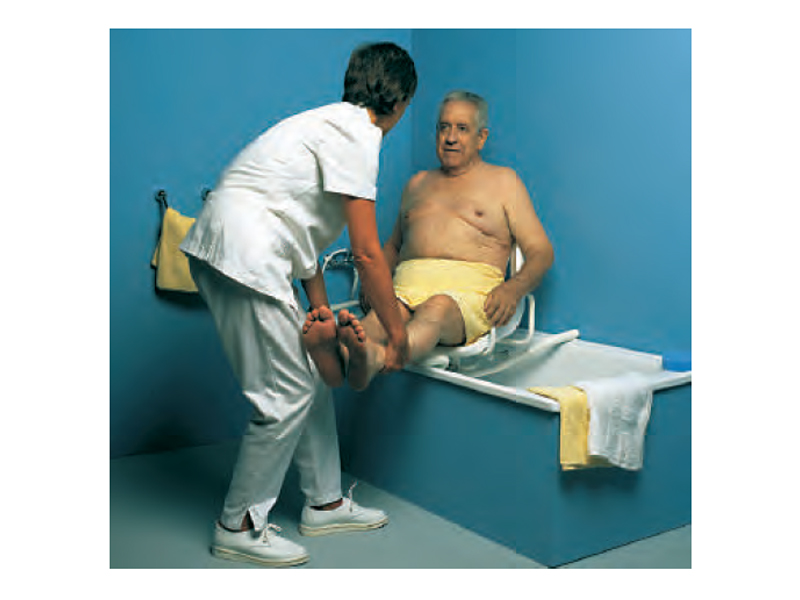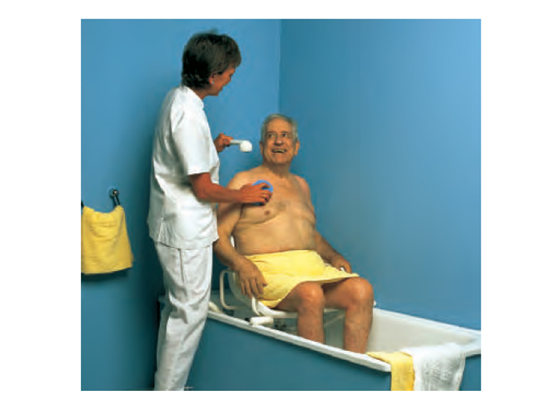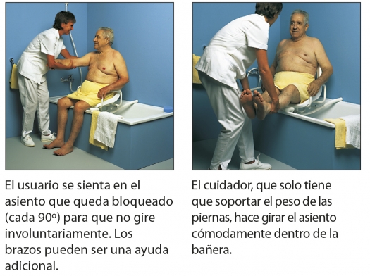 El cuidador, que solo tiene que soportar el peso de las piernas, hace girar el asiento cómodamente dentro de la bañera.
