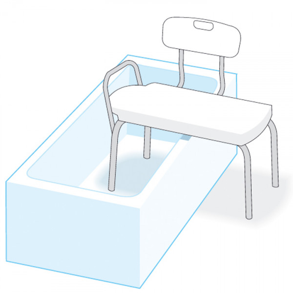 Silla de aluminio, regulable en altura de 46 a 57 cm. Se colocan dos patas dentro y dos fuera, así tendremos una silla dentro de la bañera y otra fuera. La transferencia al entrar y salir de la bañera es así más cómoda y segura. El banco de plástico tiene orificios de drenaje. La asidera reposabrazo, colocada en la parte interior del banco ofrece una ayuda adicional. Su diseño permite tener una silla dentro y otra fuera de la bañera.