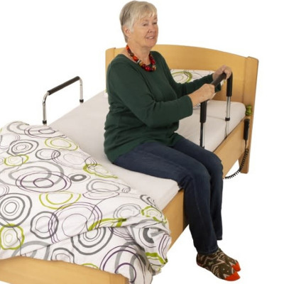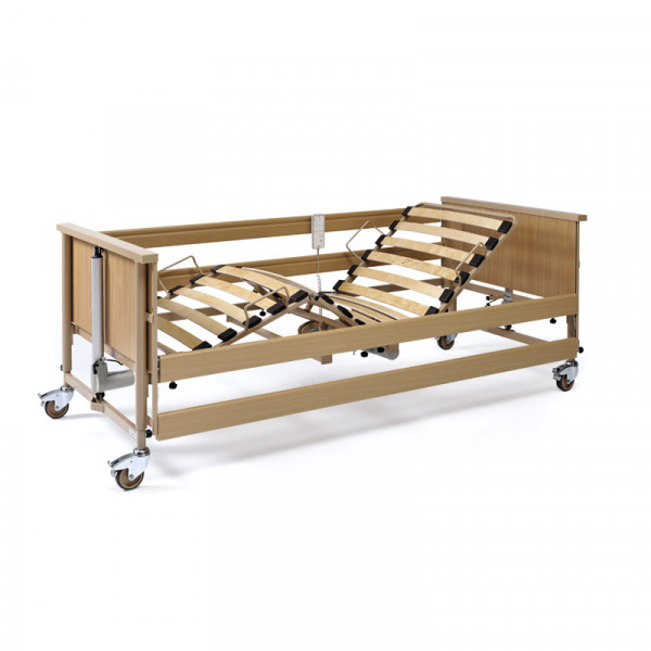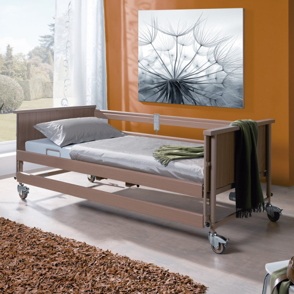 Versión para uso intensivo de la cama ECONOMIC, somier de lamas metálicas de 4 planos de 90 x 200 cm, equipada con barandillas metálicas.