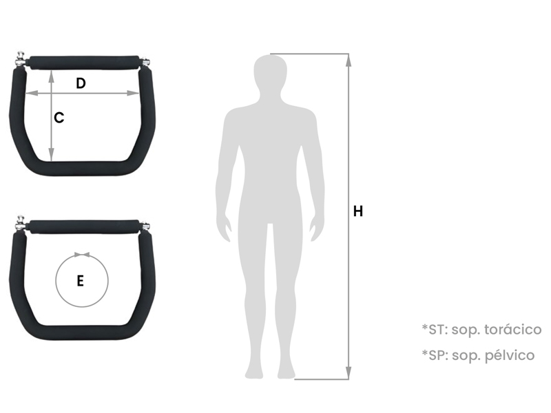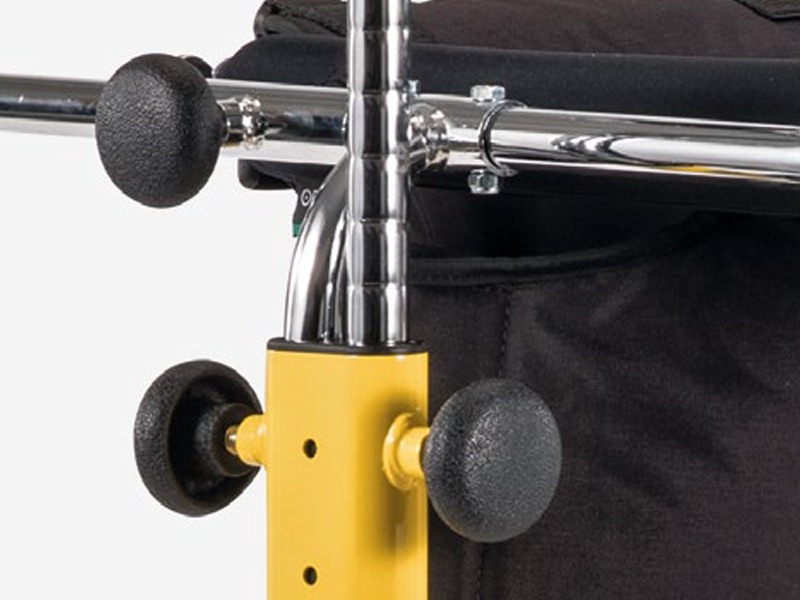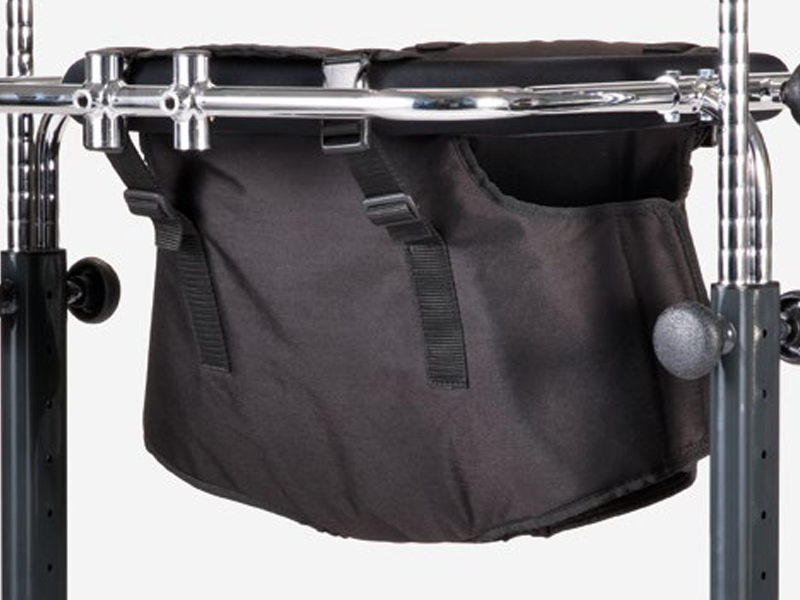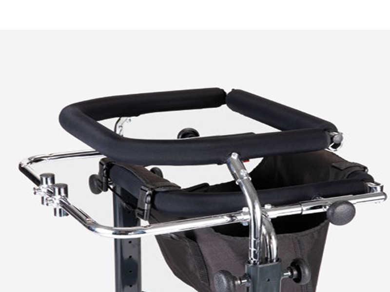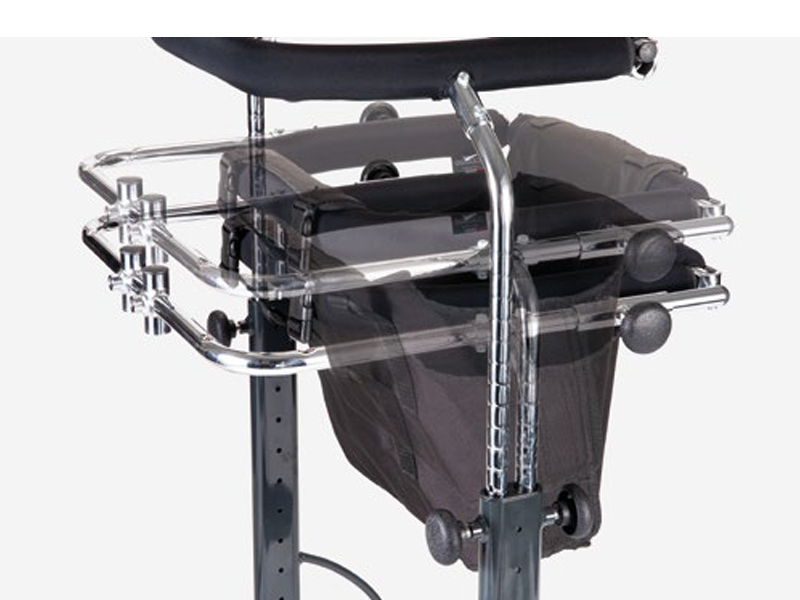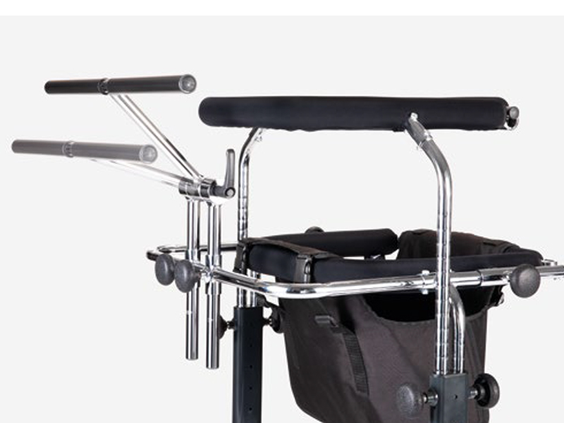 Soporte acolchado para la pelvis. Es ajustable en altura o en dirección adelante-atrás para regular el baricentro y definir la forma de andar del usuario. Permite un fácil acceso gracias a la apertura trasera.