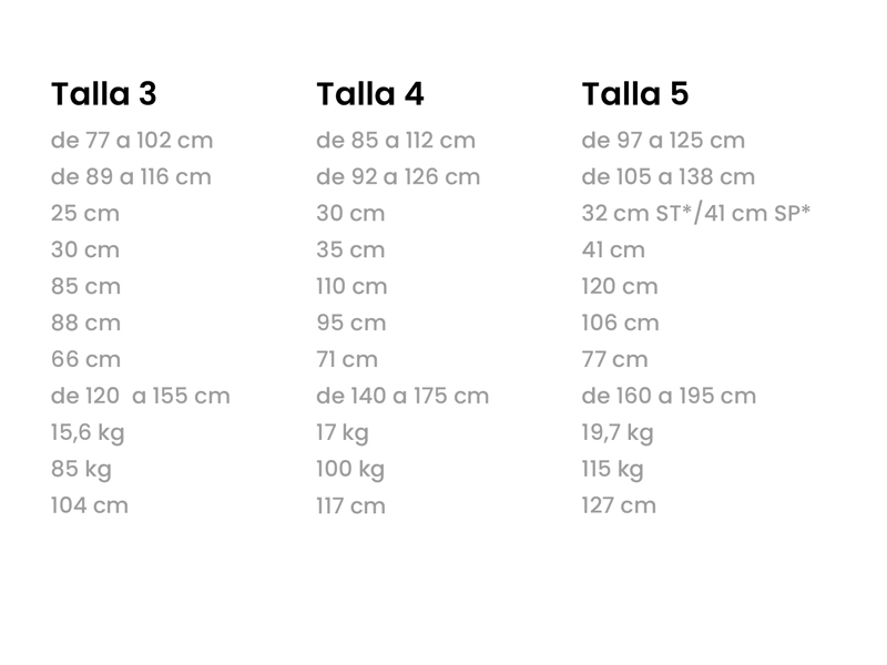 Es regulable en altura gracias a unos cinturones y en cincha con tiras de velcro. Se puede quitar fácilmente para lavar.