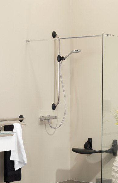 Ingenioso soporte para teléfono de ducha diseñado a partir de la observación de que las personas que no alcanzan el teléfono en la ducha suelen adoptar posturas incómodas para intentar alcanzarlo y a menudo acaban sujetándose de la manguera. Todo esto puede degenerar en una pérdida del equilibrio en un ambiente resbaladizo. Simplemente estirando de la manguera, este soporte se desliza suavemente por todo el recorrido de la barra hasta la altura deseada.