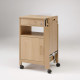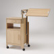 Mesa de madera para colocarse junto a la cama. Con armario, cajón y mesita auxiliar desplegable y de altura e inclinación regulable para comer, leer, etc. Con ruedas de 50 mm.