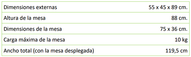 | Modelo | Alto | Ancho | Ancho desplegada | Fondo | Mesa abatible |
