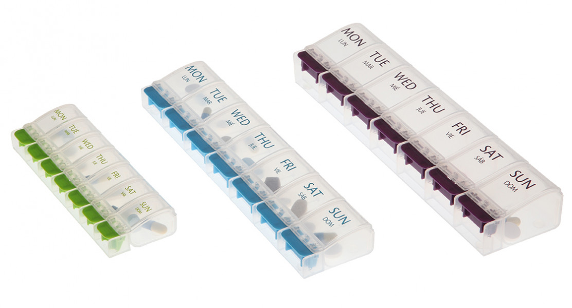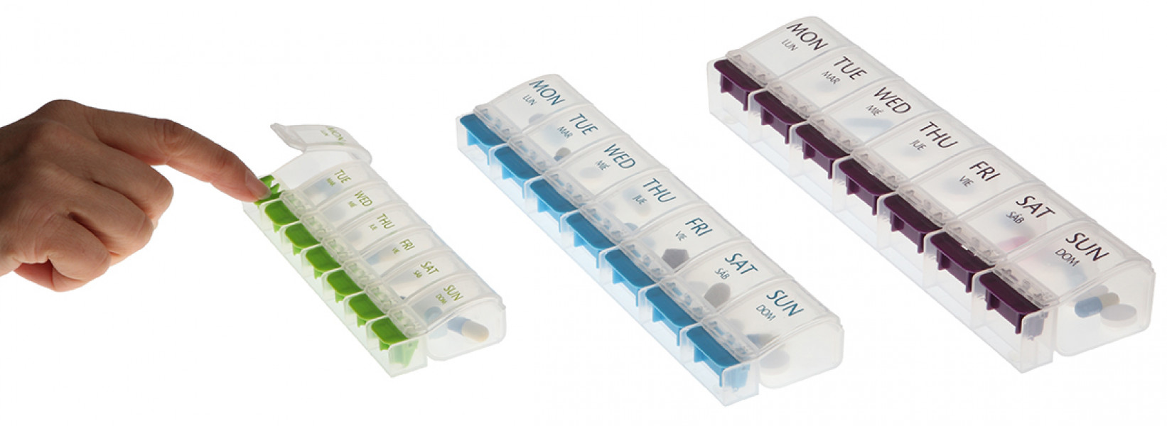 Estos pastilleros tienen como característica principal el acceso a los medicamentos del interior apretando suavemente un botón. Sus tapas son translucidas para identificar claramente los medicamentos. Gracias a su forma redondeada en el interior de los compartimentos es muy cómoda la extracción de los medicamentos. Estos pastilleros están recomendados por la fundación de artritis de Estados Unidos.