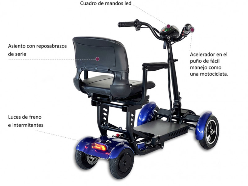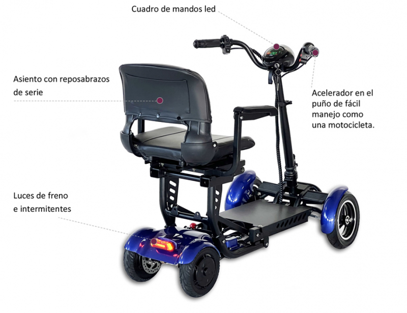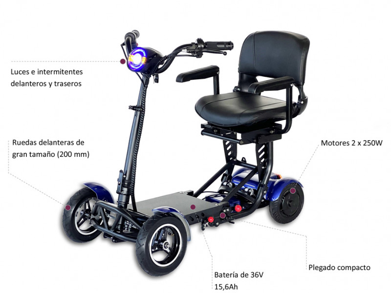 | Modelo | Longitud total | Ancho total | Ancho asiento | Altura libre | Radio de giro | Pendiente máxima | Ruedas delanteras/traseras | Potencia motor | Batería | Autonomía | Velocidad |