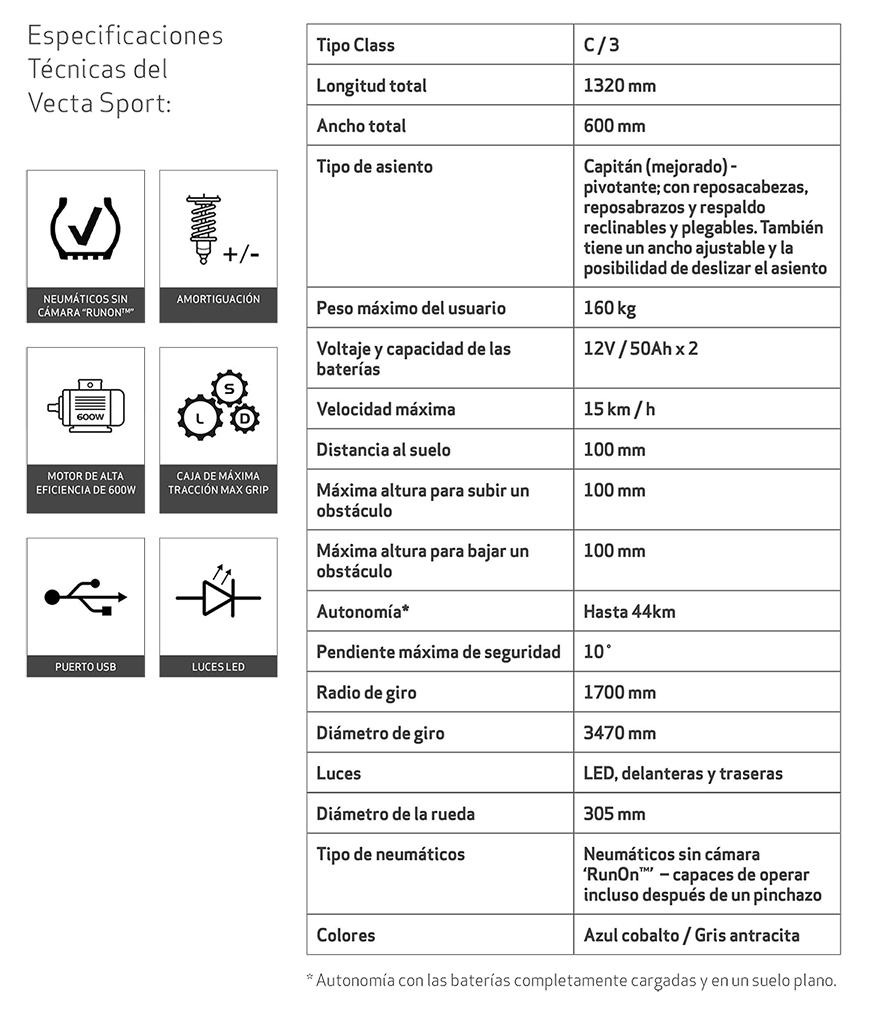 Les presentamos el modelo Vecta Sport, un scooter nuevo y revolucionario que combina un diseño de última generación con la última tecnología para ofrecer un scooter que no sólo es atractivo, sino que además tiene unas altas prestaciones. Después de más de 3 años de trabajo, el Vecta Sport ha sido creado incorporando una serie de beneficios clave para el usuario, por ejemplo, capacidad máxima de 160kg, neumáticos sin cámara ‘RunOn™’, y transmisión de alta tracción ‘Max Grip™’ para llevarle donde otros scooters no alcanzan. Donde sea que estés, con una autonomía de hasta 44km en una única carga, no hay nada que le pare.
