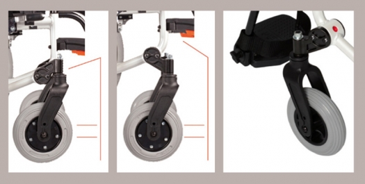 MÁXIMA ESTABILIDAD, MÁXIMA MANIOBRABILIDAD: El sistema patentando de la horquilla de la rueda delantera permite graduar de manera muy sencilla la altura del asiento al suelo a 4 diferentes alturas. Además también hace posible graduar la horquilla de la rueda delantera en 3 diferentes ángulos: -3º, 0º, +3º Este inteligente diseño consigue una silla muy maniobrable y proporciona el más alto nivel de estabilidad y comodidad durante la marcha al poder adaptar la silla a las características de cada persona.