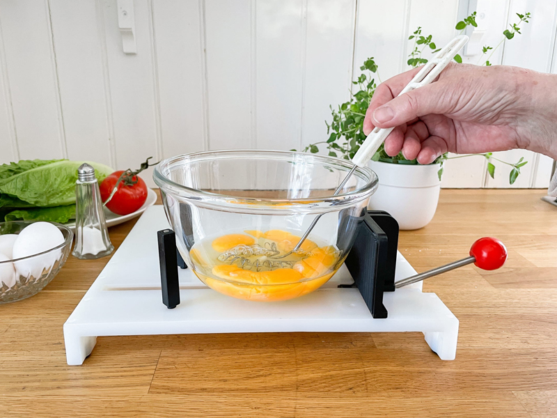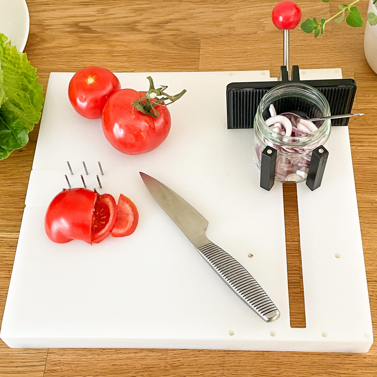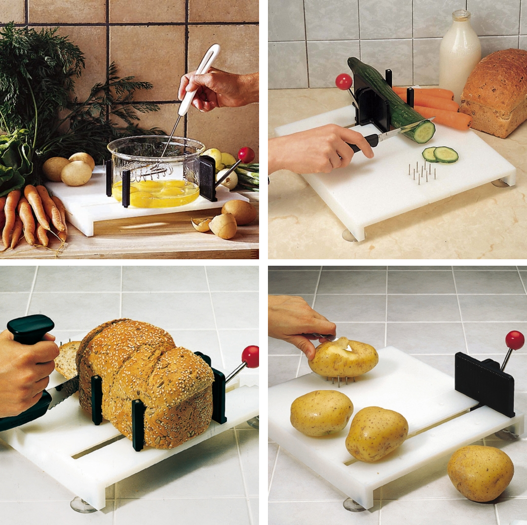 Con la tabla de preparación Fix, tareas como rallar, cortar, batir y pelar se pueden realizar incluso con manos débiles o con la función de una sola mano. La tabla se mantiene firme sobre sus cuatro patas antideslizantes o las ventosas adjuntas.