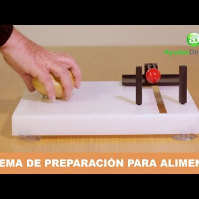 Duradera tabla de cortar de poliestireno adecuada para personas con dificultad en el agarre o que sólo pueden usar una mano. Patas antideslizantes tipo ventosa. Las púas de acero inoxidable sujetan los vegetales para cortarlos, pelarlos, etc. Medidas: 30 x 32 cm.