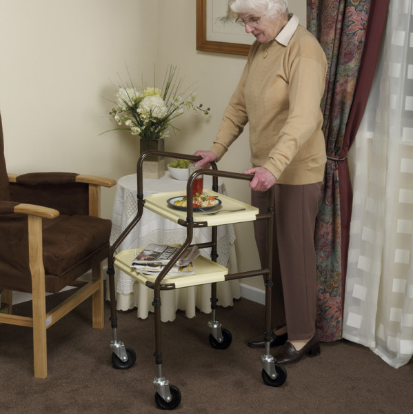 Ideal para usarlo por casa. Permite transportar objetos, una tarea difícil para aquellos que usan muletas o un caminador. Incluye dos bandejas desmontables, la inferior desplazada hacia delante para poder caminar con naturalidad mientras se empuja el trolley.